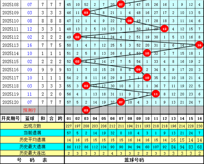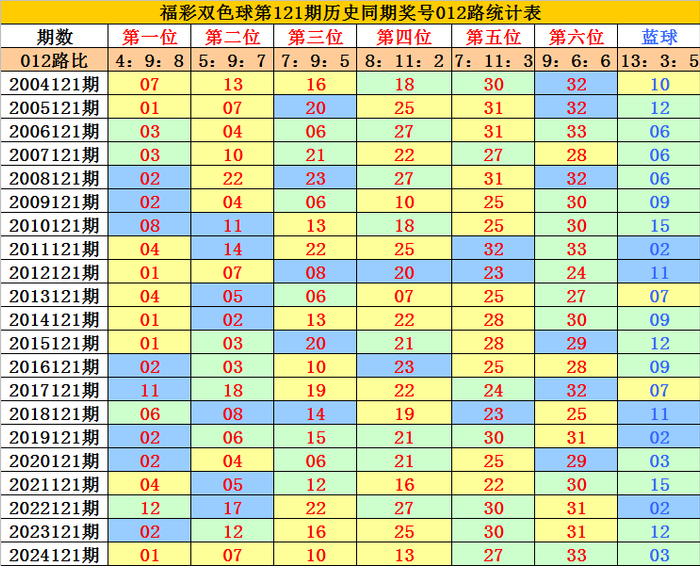 蓝球分析:第121期历史同期蓝球号码012路比开出13:3:5,其中1路蓝球开出较少,本期预计1路蓝球轮空,看好蓝球03。