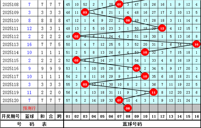 蓝球尾数分析:最近7周星期二开出5个蓝球尾数,重复蓝球尾数明显活跃,本周星期二注意蓝球尾数为近期热码尾数,参考蓝球08。